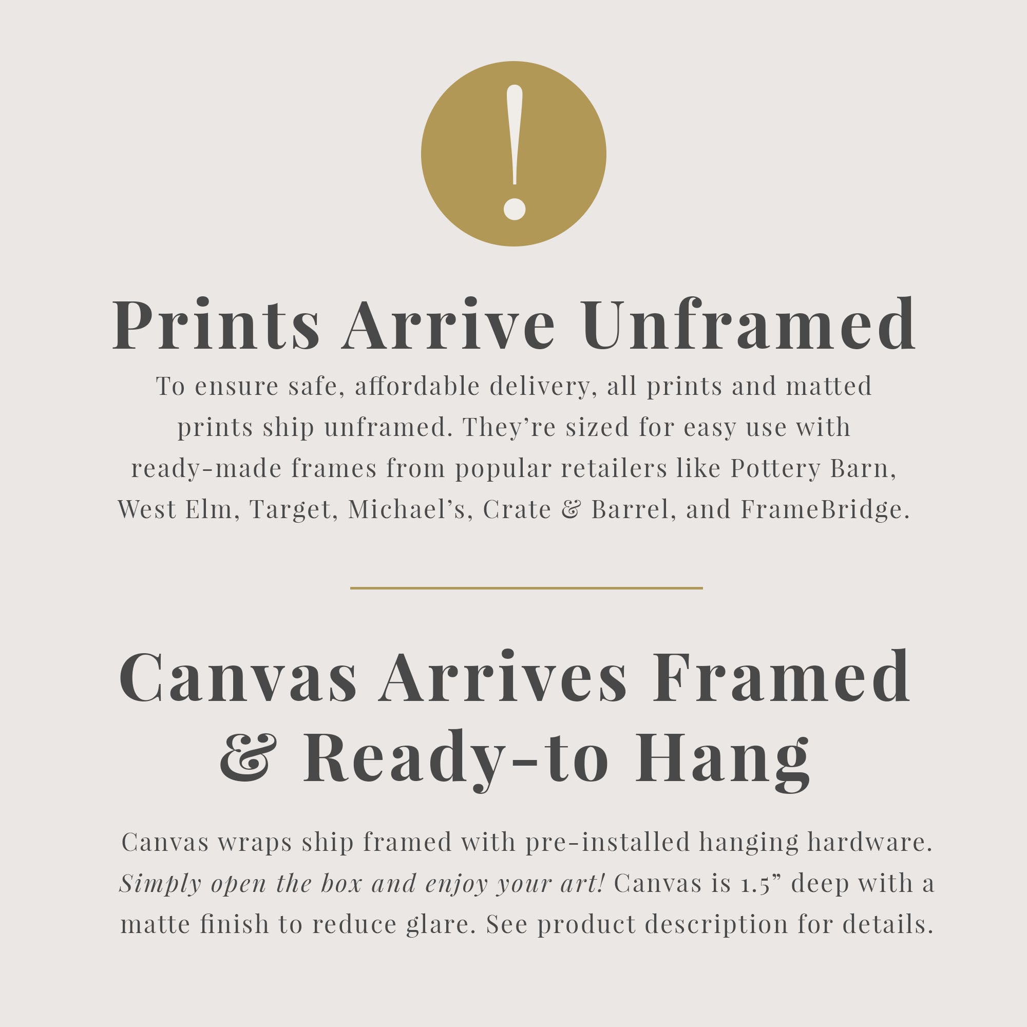 CANVAS WRAPS: Archival textured matte canvas, gallery-wrapped at 1.5" depth. Arrives ready to hang with pre-installed hardware.